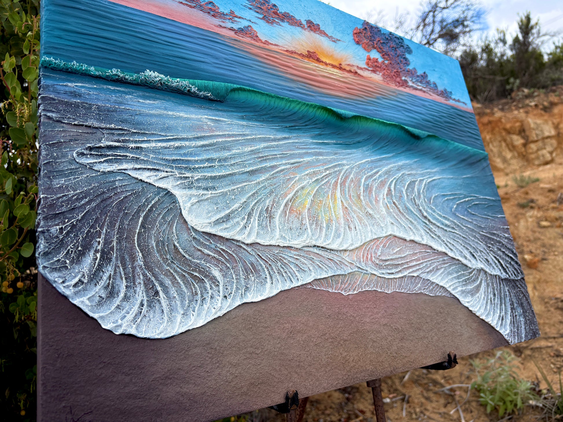 Mixed Media Ocean sculptural painting made with plaster and acrylic on cradled wood panel.