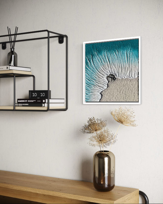 Framed Mixed Media Ocean Painting made with plaster and acrylic on cradled wood panel.