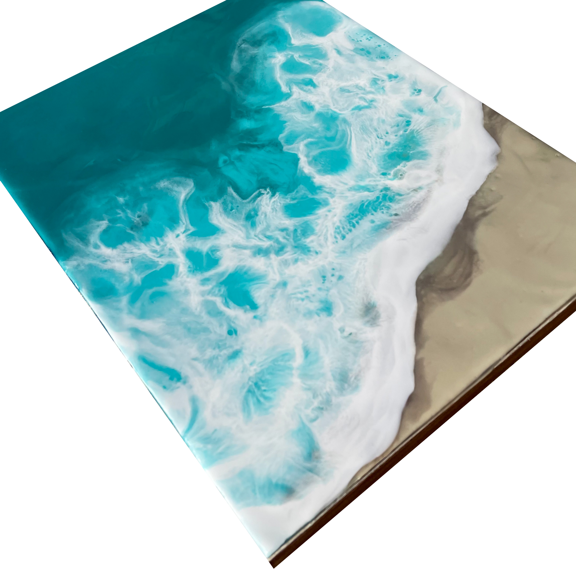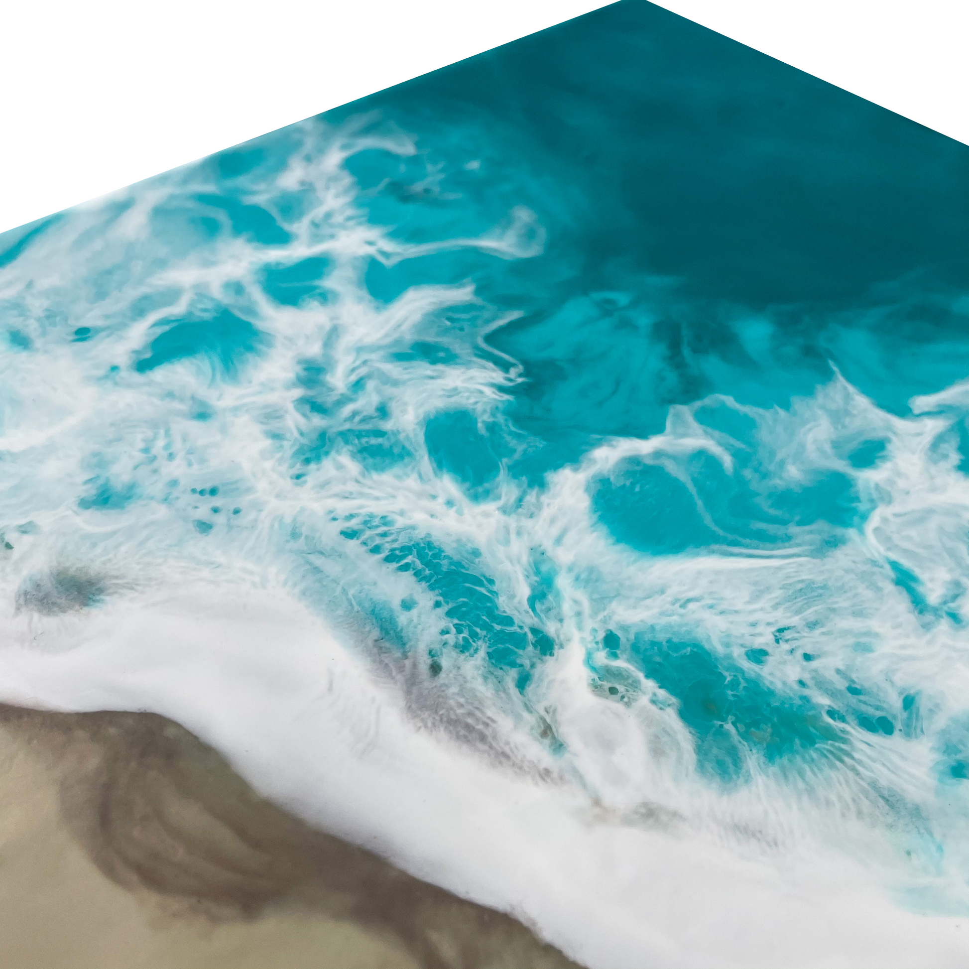 Encaustic Ocean Painting made by layering beeswax and oil paints on 1" cradled wood panel framed with a 1.5" Doug Fir, white floater frame.